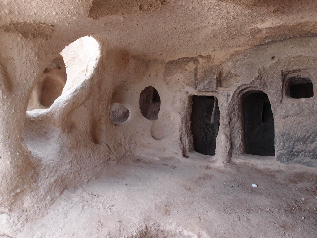 Si visitamos Derinkuyu podremos ver las viviendas de sus moradores, que residían allí junto a sus animales domésticos, pero también podremos ver otro tipo de estancias cómo las dedicadas al culto (iglesias), cementerios y tumbas, establos, graneros, bodegas, cocinas...
